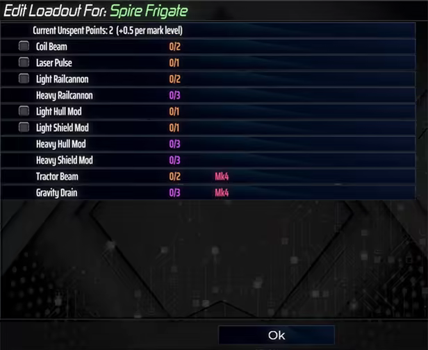 From here, you can then pick which weapons and bonuses you’d like to apply to the ship/ship line. Maybe you want yourself some infinite range harassment loadout, or a tanky heavy hull to weather some extra damage. The modular ship system is point based. You start with a certain amount and as you mark up a modular ship/ship line, it gains additional points to spend, as well as more modules to use.