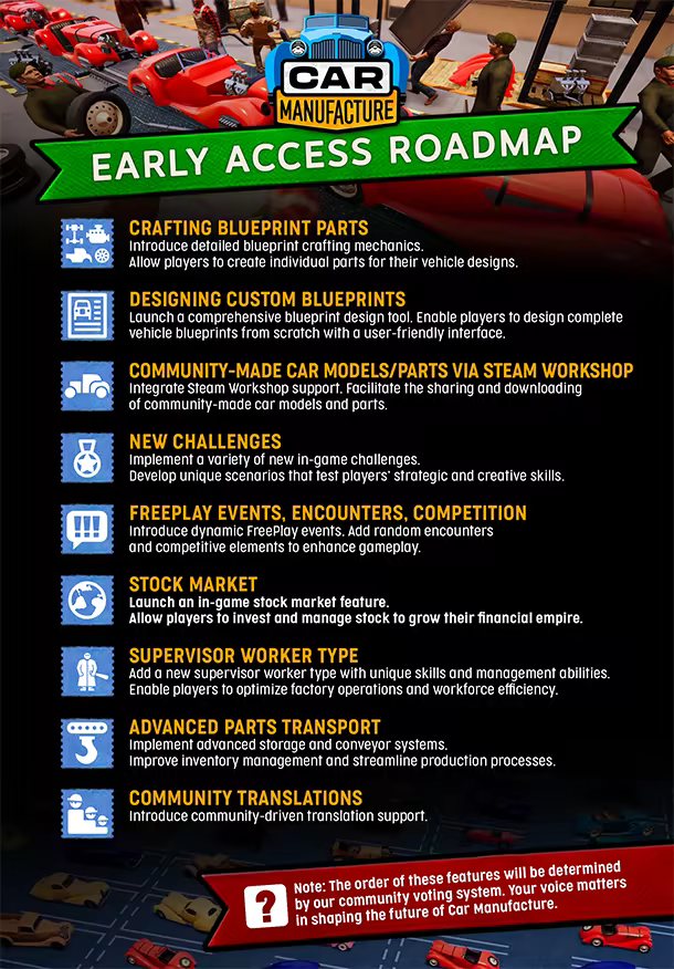 您創建的每輛汽車背後都有具有不同經驗水平的人。確保工廠以全速運行是您的責任。管理和培訓員工,根據他們的技能分配任務。保持他們的滿意和充足的休息以確保有效的工作。然而,請記住,受過良好培訓的員工要求更高的工資。