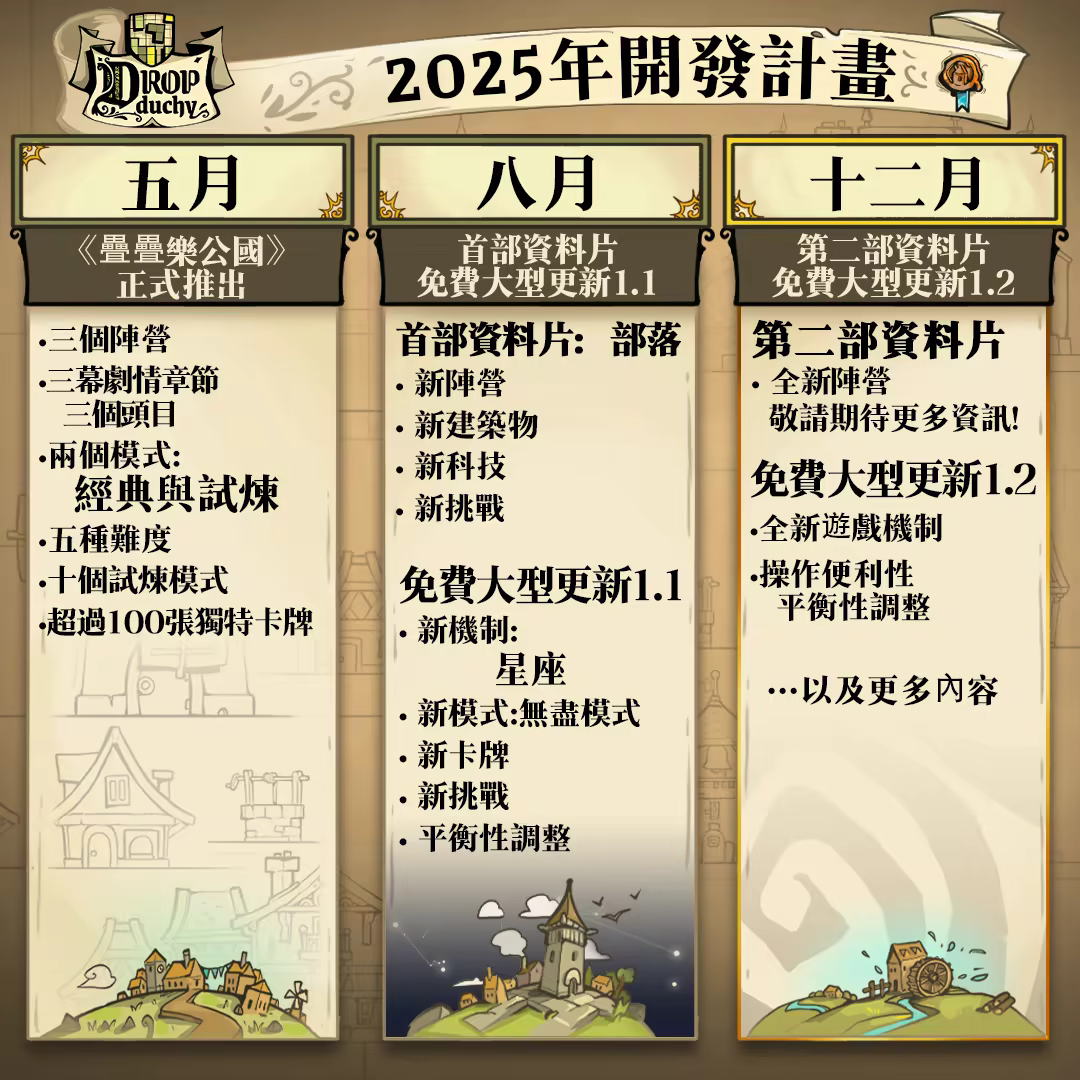 《疊疊樂公國》(Drop Duchy) 具有強大的元進度系統,包括100個獨特的挑戰!提升等級並解鎖各種獎勵,譬如更多資源、新卡牌以及額外生命值。