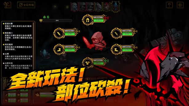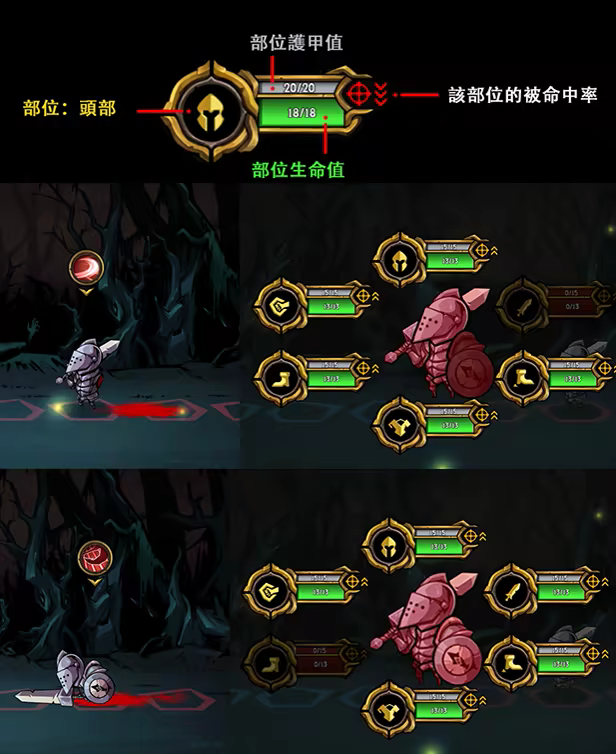 《不是地下城》裏戰鬥的核心玩法、遊戲機制依托在對不同部位的不同選擇所造成的不同結果來體現。我們想把更多有趣的內容與我們的遊戲相融合。角色的每個部位都有其獨有功能性以及規避傷害的幾率,每個部位根據角色設定的不同會有相應的護甲保護,而且護甲的類型有多種以應對不同的傷害類型。