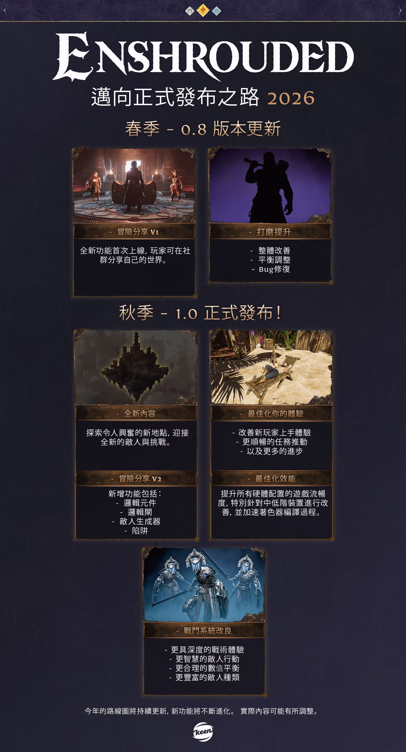 製作、升級傳奇武器與護甲。解鎖更多技能,熟練使用刀劍、盾牌、法杖與弓箭,以此對抗霧幕。