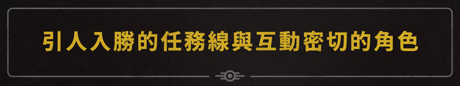從踏出76號避難所那刻起,開始投入引人入勝的主任務線,一步步揭露西維吉尼亞的祕密。新來的鄰居打算重建此地,你可以選擇與其交好或是背叛,然後透過此地居民的眼睛認識阿帕拉契。