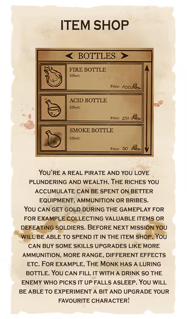 你是一個真正的海盜,你喜歡掠奪和財富。你積累的財富可以花在更好的裝備、彈藥或賄賂上。