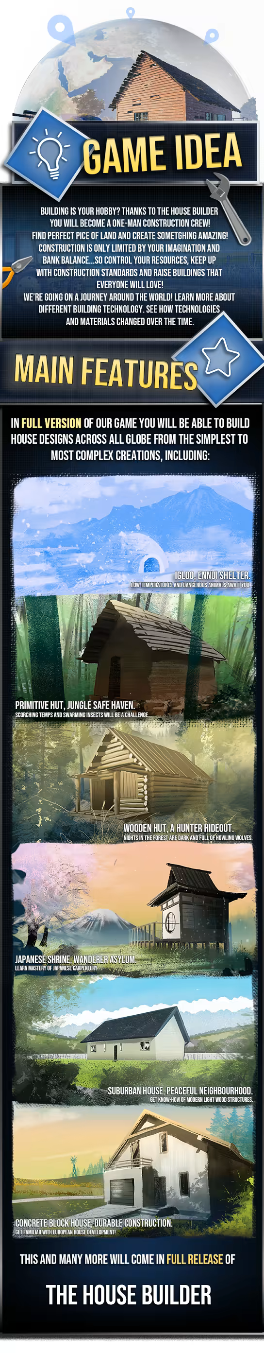 讓我們帶您遊覽全球各地,體驗真正的建築多樣性。您將嘗試在非洲建造泥屋,在北極建造冰屋,在加拿大建造房屋,在西伯利亞建造小木屋,用磚塊、氣磚或混凝土建造的傳統房屋等等……