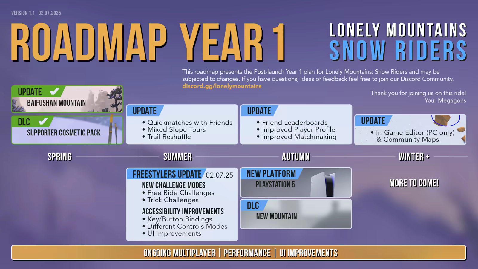 Snow Riders also adds a brand new feature to the Lonely Mountains world – online multiplayer! Work your way down the mountain as a team in co-op, carefully sharing your limited checkpoints, or compete in a breakneck race to the base in versus mode. Available for 2-8 players, with multiplatform crossplay.