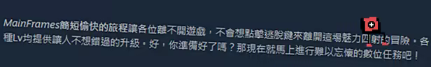 在MainFrames中,各位將會引導磁碟片。在引導的過程中,將會重新配置程式視窗、打造新路徑、在影格之間跳躍來探險數位世界。在各位探險的所有區域中,充滿了獨特的視覺風格、創新的機械原理及各種隱藏的祕密。聆聽沉穩的原聲帶,在遊戲中進行各種迷人的益智遊戲與平台遊戲挑戰課題等經驗…也許你就不會想回到現實生活中!