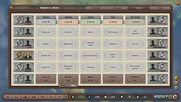 In the game, you can increase the production plan of workers, the length of the working day and reduce wages. But the threat of a strike will grow, the accident rate of the enterprise will increase. The staff will be furious, all the unions will turn on you, but the profitability of the companies will increase.