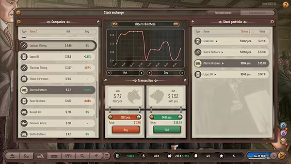 Issue stocks and bonds, capitalize your companies and bring them to the stock exchange. Unite your companies into trusts and monopolies, expand your zones of influence and capture market shares. You can merge companies and absorb small ones in the market. Or you can use more dirty methods of competition.