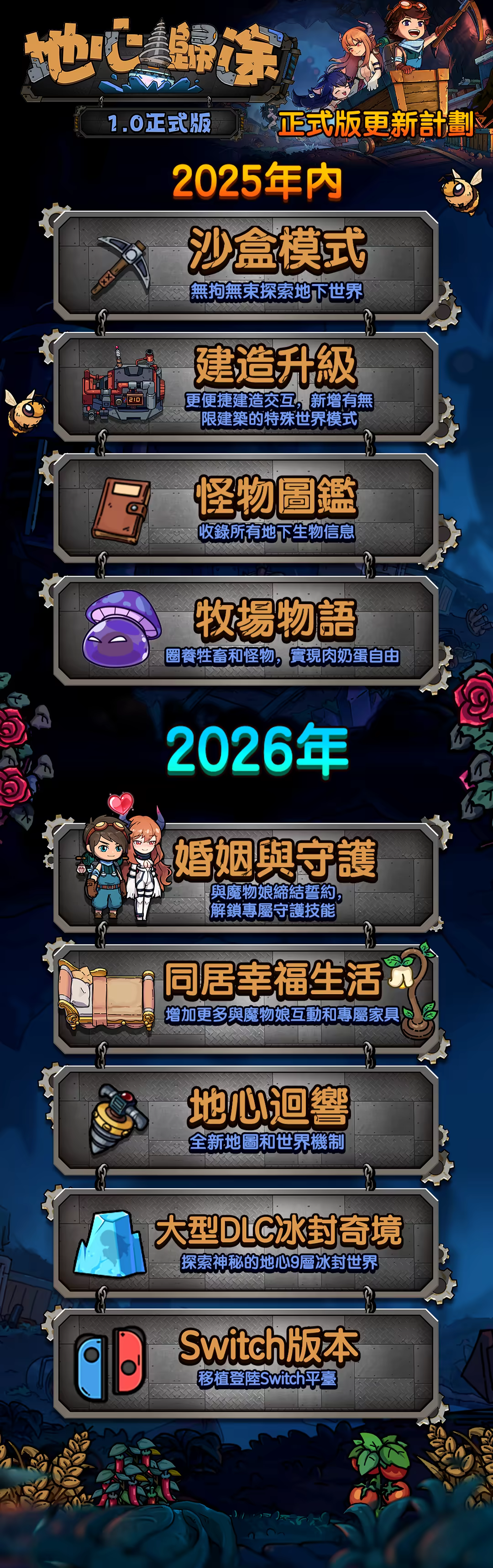 在地底的冒險途中,你將邂逅擁有特殊能力的魔物娘。她們性格各異,喜怒無常,但若能贏得她們的信任,她們不僅會成為並肩作戰的強力夥伴,在探索中施展各自獨特的技能,還能在營地中協助從事各類工作:耕種、烹飪、採集、生產,全面提升你的生存與發展效率。