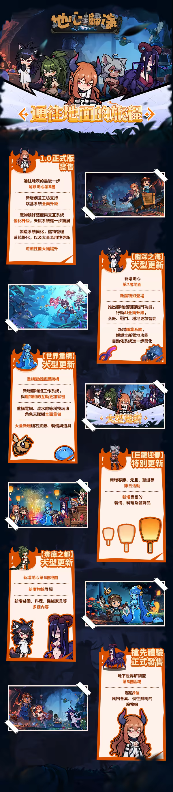 現在,拿起你的礦鎬,攜手魔物娘夥伴,探索地底的無盡秘密,成為第一個重返地表的人類吧!