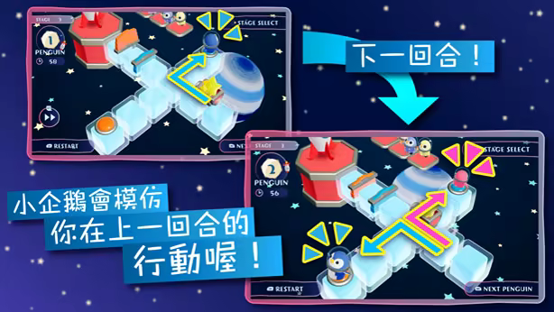 小企鵝會一隻一隻地分別模仿(重複)玩家的上一步行動唷。