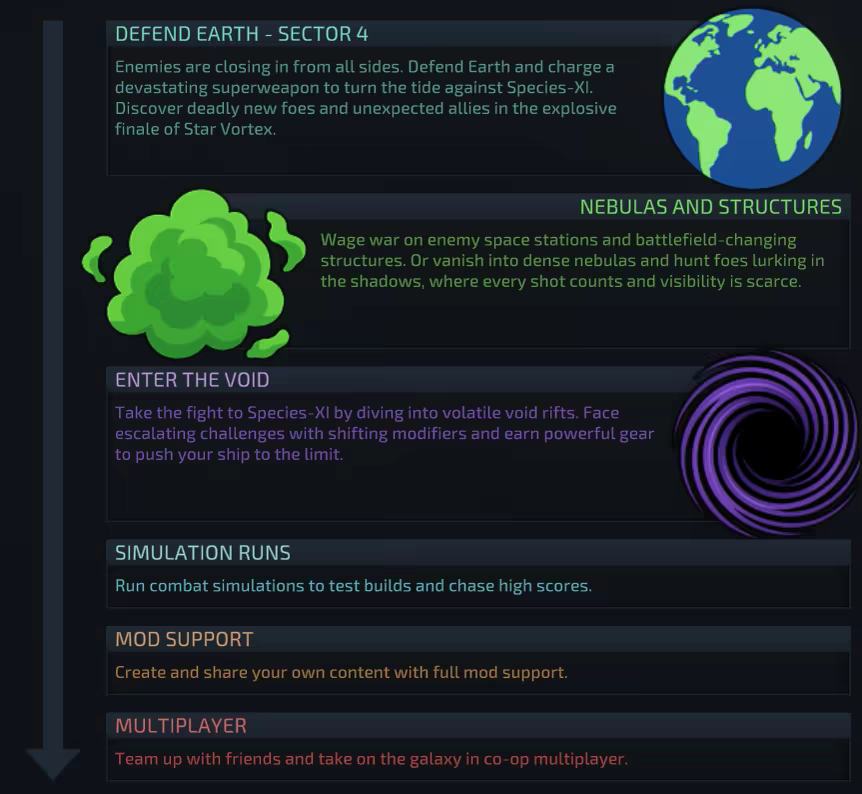 You play as a pilot of a fighter ship who must venture out into the space sector to find the gateway keys that will allow the mothership to reach Earth. Throughout your journey, you will gain experience allowing you to level up and upgrade your ship from a small frigate to a massive battleship while collecting equipment that synergizes with your build and playstyle. Explore randomly generated sectors fighting elite enemies and bosses then work your way up through difficulties.