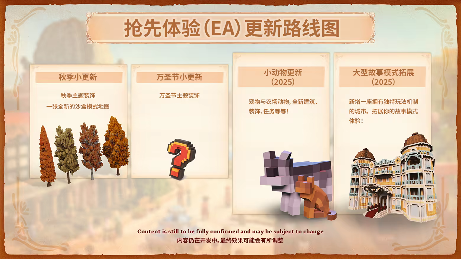 運用各種豐富的自訂選項美化定居地,打造出一個理想世界。設置燈光、種些花,打造綠意盎然的公園來點綴每個角落,還能根據您的風格裝飾房屋和建築,創造完美的和諧或大膽的對比。以精美的立體像素為基礎,輕鬆打造出讓人驚豔的場景,隨時用遊戲內拍照模式記錄這些美好時刻。